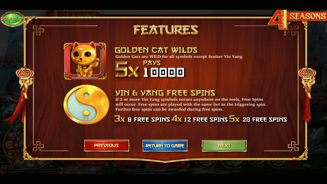 Фриспины можно продлить. Дополнительные вращения активируются, если по ходу текущего раунда выпадет еще минимум три спецсимвола Инь-Янь. Призовые спины проходят по ставке, установленной на момент их активации.